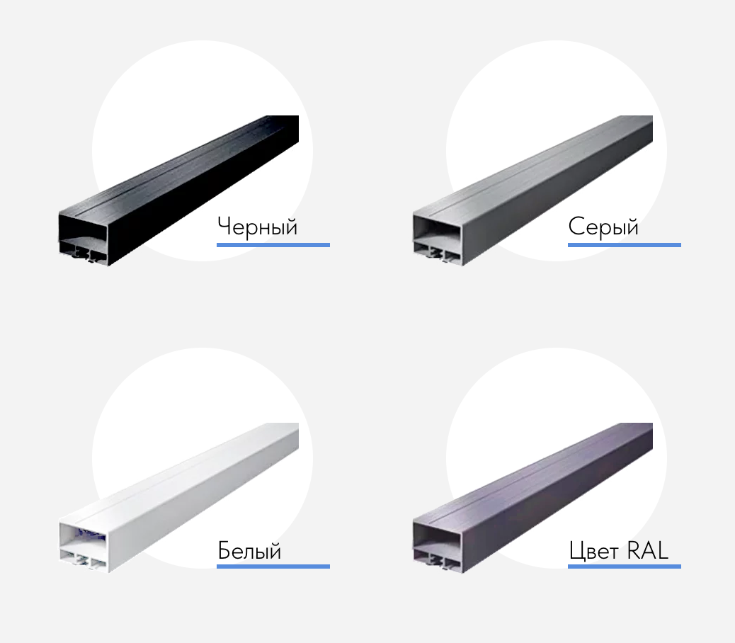 Профили имеют прямоугольное или квадратное сечение и могут быть окрашены в черный, серый, белый или любой цвет по RAL (на ваш выбор).